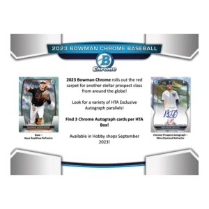 Experience the pinnacle of collector’s delight with the 2023 Bowman Chrome Baseball HTAΒ Jumbo Box. Each box features hand-picked premium chrome trading cards, including autographed gems from top stars and prospects. Elevate your collection today and own a piece of baseball history!