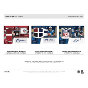 Absolute Football returns for a new season with all of its landmark calling cards including Rookie Premiere Materials Autographs, Tools of the Trade, Jumbo Memorabilia cards, fan-favorite Kaboom!, Explosive and Glass case-hit chases and so much more.