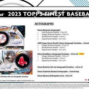 Prepare yourself, as the latest installment of Topps Finest Baseball for this year is poised to impress and enthrall fans in an unprecedented way! Embrace the exhilarating excitement of the 2023 Topps Finest Baseball Hobby Case, where a remarkable fusion of striking new aesthetics, cherished favorites, and an exclusive collection of 16 Chrome Autographs come together to exhibit the absolute best of baseball’s superstar players and emerging talents!Β