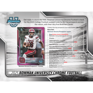 The 2025 Bowman University Chrome Football Hobby Box brings collectors closer to the future stars of the gridiron with premium chrome technology and stunning parallels. Each box offers a chance to pull autographs from top college prospects and exciting inserts that highlight the next generation of NFL talent. Look for exclusive refractors, color variations, and rare case hits that make this one of the most exciting collegiate football releases of the year. Whether youβre prospecting for the upcoming draft class or building your PC, Bowman U Chrome delivers unmatched value and shine.