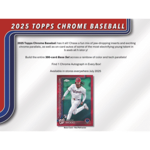 The 2025 Topps Chrome Baseball Hobby 12 Box Case features 20 packs per box with 4 cards per pack, delivering one Chrome autograph per box on average. This year’s release builds on the iconic Chrome brand with a 300-card base set and a fresh lineup of colorful parallels like Refractors, Prism, X-Fractors, RayWave, and the all-new FrozenFractor. Collectors can also chase short prints such as Chrome All-Etch and All-Etch Rookie Rush, as well as a deep insert lineup including Helix, Hobby Masters, Radiating Rookies, Lightning Leaders, Numbers Live Forever, and World Series at Night. With its signature chromium finish, star-studded checklist, and chase-worthy inserts, 2025 Topps Chrome continues to be a flagship for collectors of both rookies and legends alike.