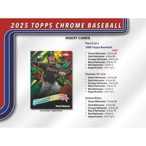 • 2025 Topps Chrome Baseball has it all! Chase a fun mix of jaw-dropping inserts and exciting chrome parallels, as well as on-card autos of some of the most electrifying young talent in baseball history!