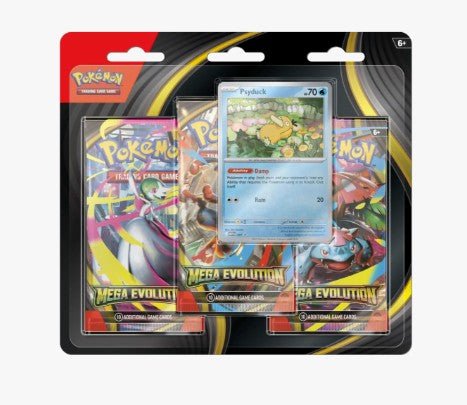 Each blister comes with 3 Mega Evolution booster packs and a promotional card of Psyduck.