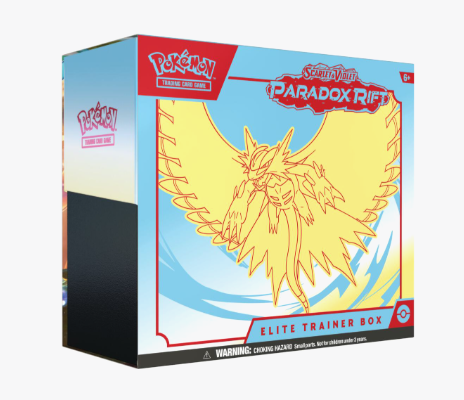 The PokΓ©mon TCG: Scarlet & VioletβParadox Rift Elite Trainer Box includes: β’ 9 PokΓ©mon TCG: Scarlet & VioletβParadox Rift booster packs β’ 1 full-art foil promo card featuring Scream Tail or Iron Bundle β’ 65 card sleeves featuring Roaring Moon or Iron Valiant β’ 45 PokΓ©mon TCG Energy cards β’ A playerβs guide to the Scarlet & VioletβParadox Rift expansion β’ 6 damage-counter dice β’ 1 competition-legal coin-flip die β’ 2 plastic condition markers β’ A collectorβs box to hold everything, with 4 dividers to keep it organized β’ A code card for PokΓ©mon Trading Card Game Live